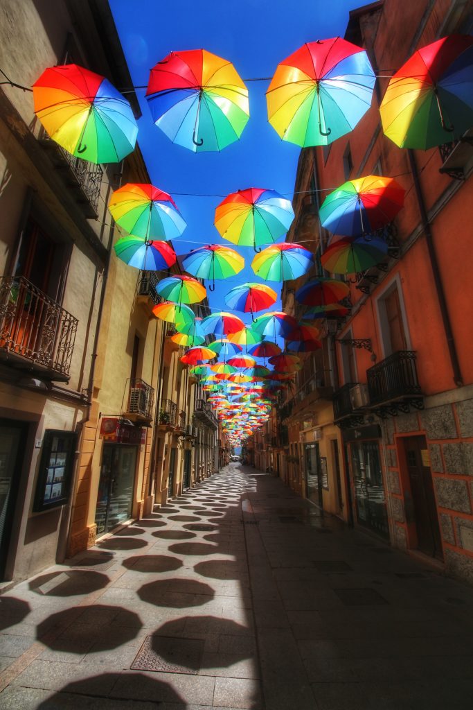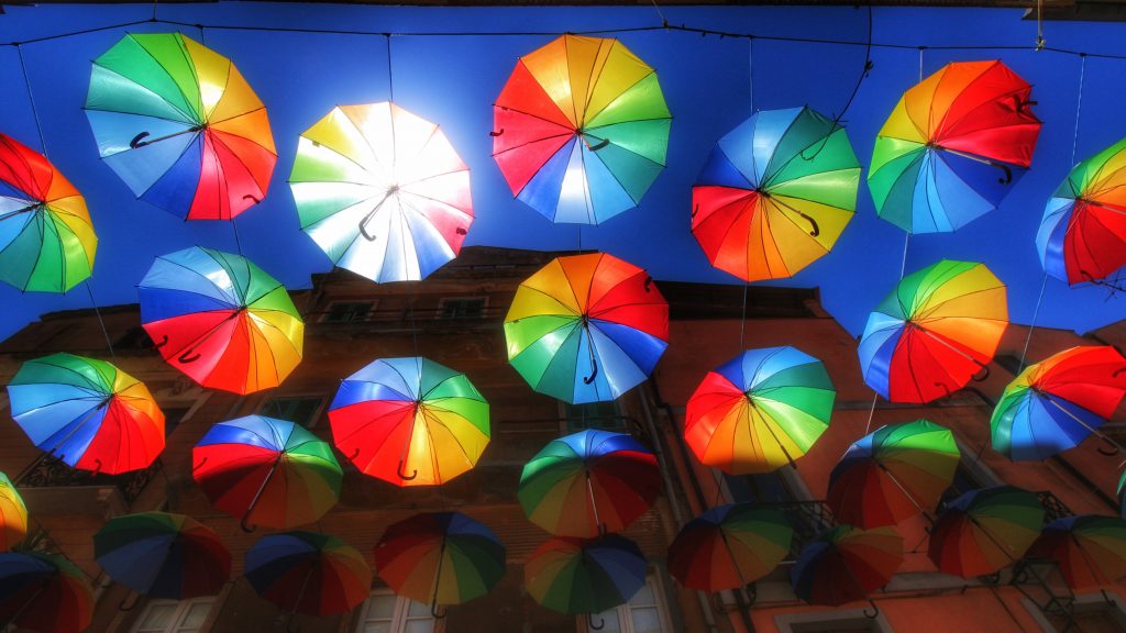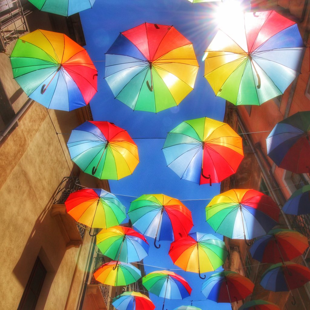 Umbrellas in Churches July 6, 2017 Taken with Canon 700D. Street celebrating something (Pride?) in Iglesias, Sardinia.