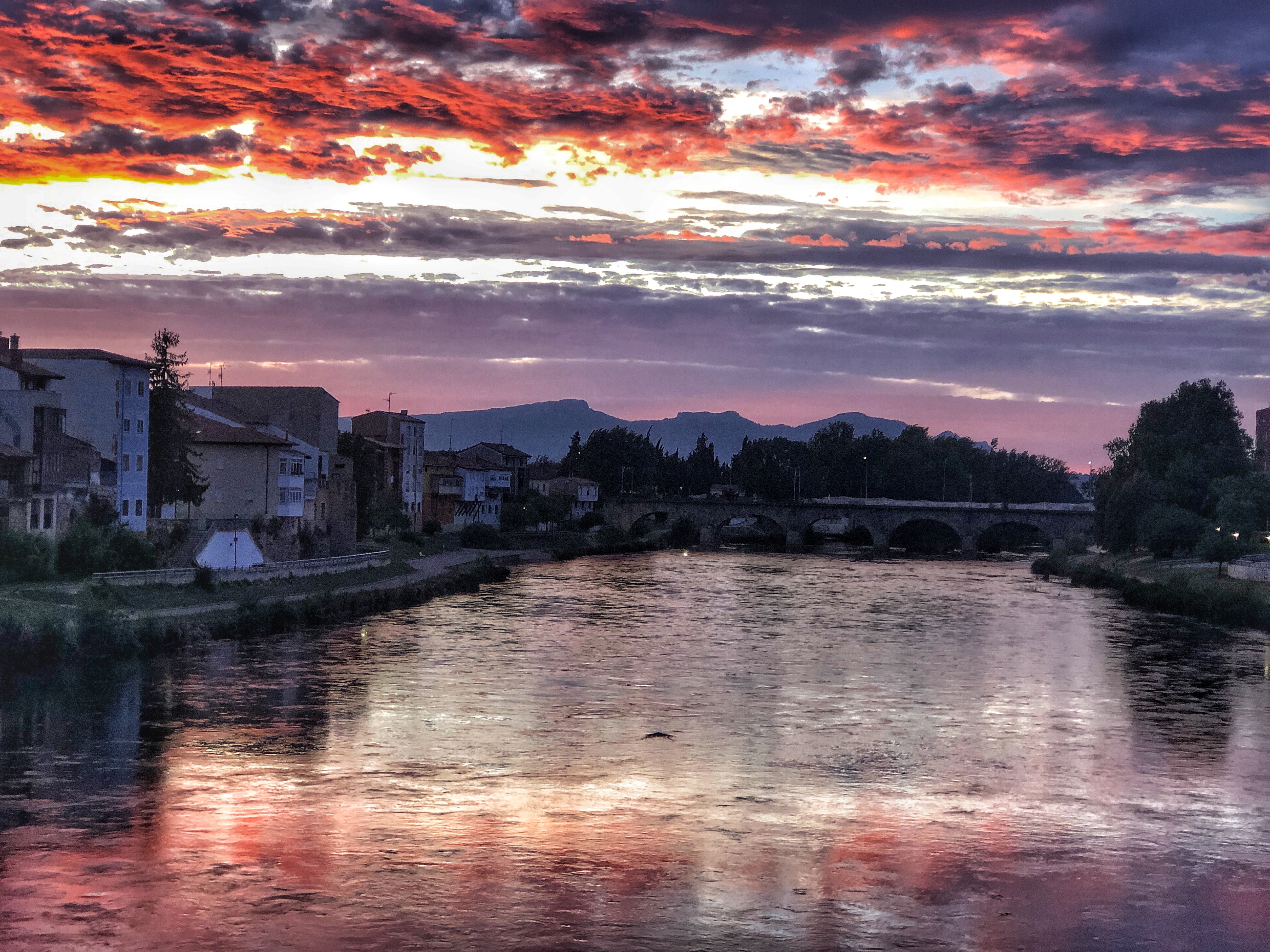 Miranda de Ebro sunset (pre and post) August 10, 2019 Taken with iPhone 8+. Each shot straight from phone and then with some post-processing. Taken from the Carlos iii bridge, Miranda de Ebro.